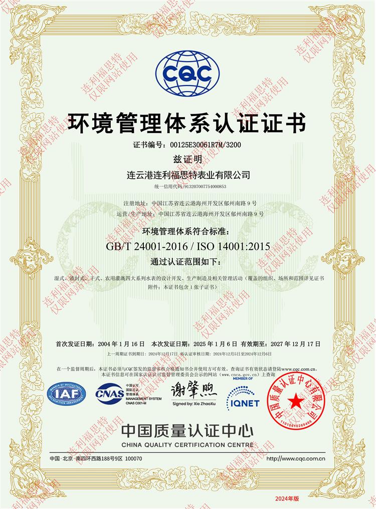環(huán)境管理體系認證證書